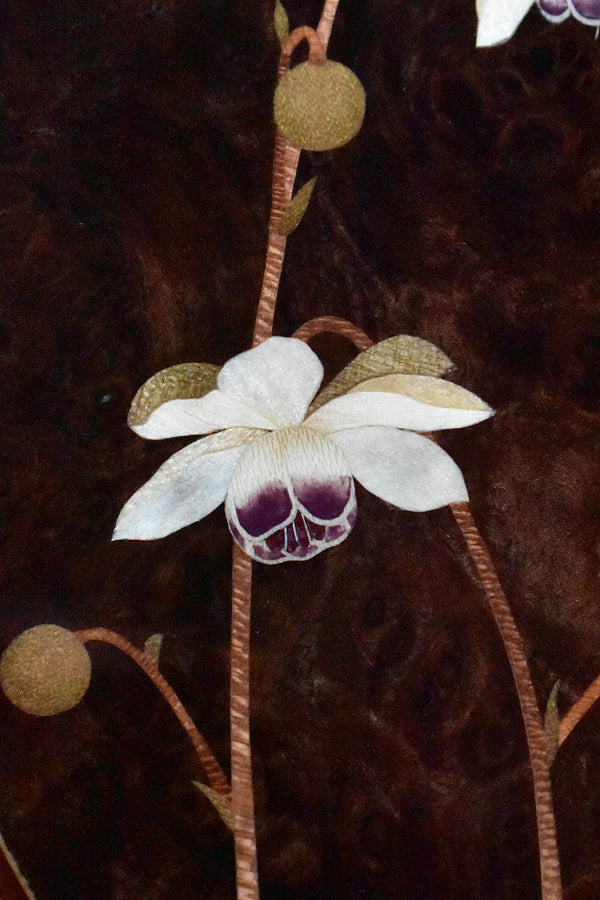 花のバックの板はアメリカンブラックウォールナットの杢です。